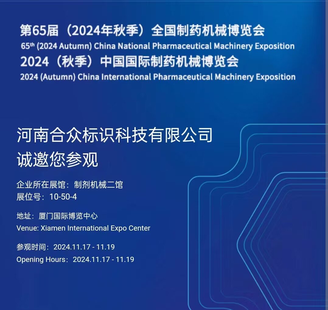 2024秋季中國(guó)國(guó)際制藥機(jī)械博覽會(huì)(11月17日–19日),制劑機(jī)械二館10-50-4,河南合眾標(biāo)識(shí)科技有限公司歡迎新老朋友蒞臨參觀