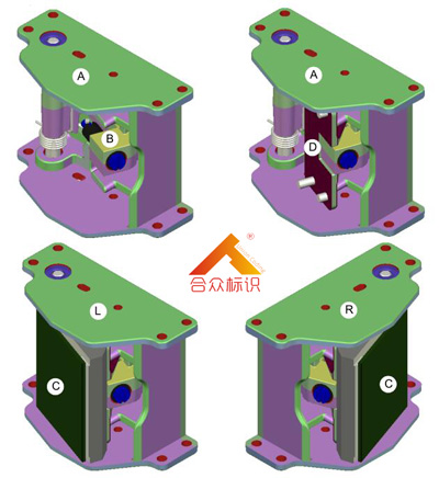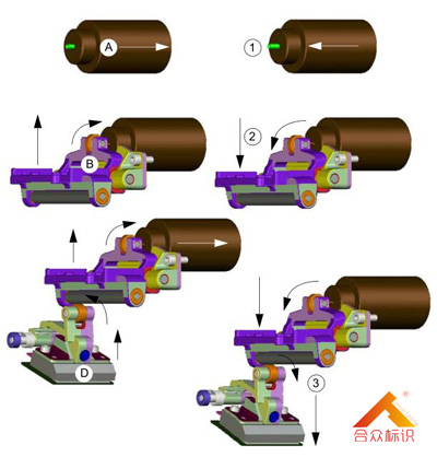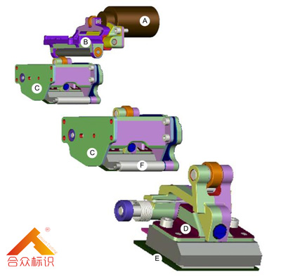 打印系統包含 24V 的電磁圈 (A),傳動裝置 (B)、打印模塊盒 (C),打印模塊盒中