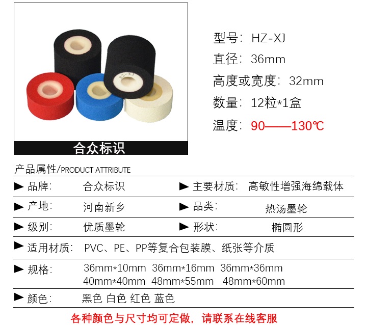 熱燙墨輪配套于墨輪打碼機(jī)、380識(shí)標(biāo)機(jī)、封口機(jī)等包裝打碼機(jī)械,應(yīng)用于食品、醫(yī)藥、飲品等行業(yè)。在各種軟包裝、紙張、塑料袋等材料表面打印各種文字、數(shù)字標(biāo)識(shí),具有使用方便、字跡清晰、不易脫落、快干等特點(diǎn)。墨輪是由海綿體和固體油墨組成,配套于墨輪機(jī)使用,用于塑料、薄膜、紙質(zhì)等材料表面印制生產(chǎn)日期,批號(hào)等標(biāo)識(shí)。固體墨輪是比之油墨更為先進(jìn)的打印材料,采用固體墨輪,字跡清晰、 瞬印瞬干,附著力強(qiáng),顏色多樣、更換方便,成本低,且無油墨污染之憂。具有使用方便,字跡清晰、不易脫落、快干、無溶劑污染、打印次數(shù)多等優(yōu)點(diǎn),與墨輪機(jī)配合可實(shí)現(xiàn)快速打印。